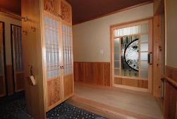 「あまり維持管理に時間をとられない、そして子どもが遊べる広い庭が理想」という奥さまの要望を踏まえ、鮮やかな芝生と整然と植えられた樹木、竹と木、荒々しい石で造られた垣根のある庭。シックなエントランスホール。玄関を開けると建具職人による和の雰囲気一杯の玄関が出迎えてくれます。