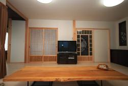 ステンドグラス作家、三上裕子さんの作品がはめ込まれたモダンなドアを開けると広々としたリビング。収納用建具や神棚、テーブルも大工さんの手造りで一体感のある和の空間が広がっています。洗面室や2階のミニ書斎など至る所が重厚感のある木材と職人の技によって演出されています。