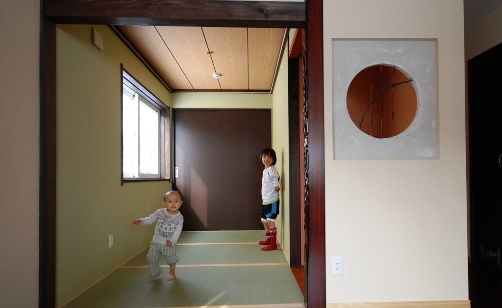 奥様のお気に入りは、リビングから玄関の方を見る眺め。シックな土間床とステンドグラス入りの特注品の扉、玄関横の靴入れが見える場所です。こことリビングに隣接する5・8㎡のタタミコーナーは同社が得意とする和の演出が発揮されています。