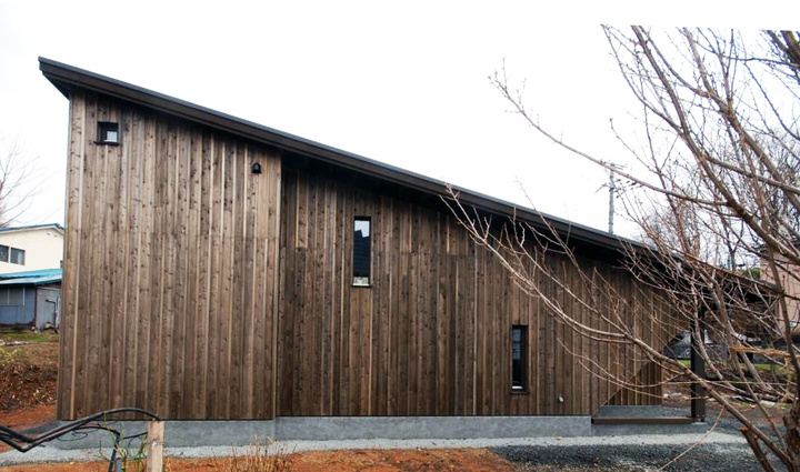 外壁に使用した道南杉は、自然素材の風合いが魅力的で、オーナーさんと建築家が意気投合し採用されました。メンテナンスの負担が少なくなる特殊な塗料を使ったことで、日焼けや風雨により次第に味わい深い外壁となっていきます。