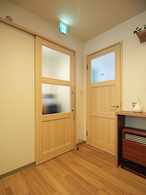 そこで4つあった治療用の椅子を3つに減らし、間隔を十分空けるようにしました。椅子と椅子の間には木の枠に下半分だけ曇りガラスをはめ込んだ目隠しがあります。