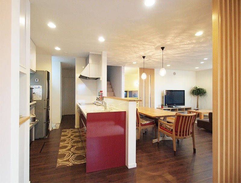 1階の中心は、家族が集まるリビングです。ダイニングキッチン、洗面台、和洋室と間仕切りなしでつながり、開放感のあるつくりになっています。