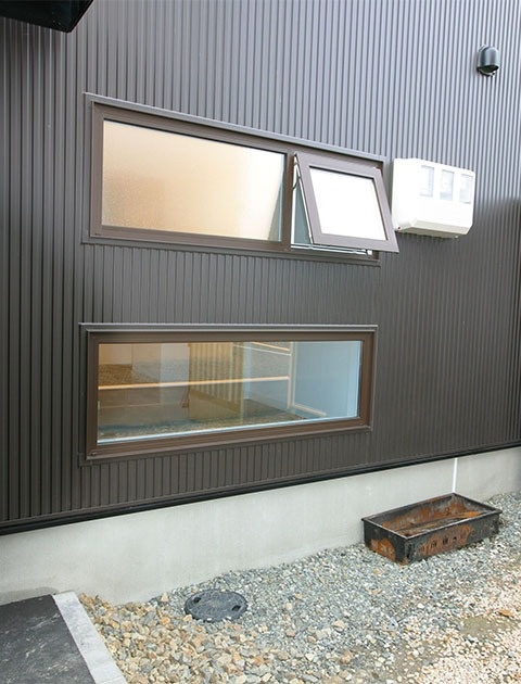 外観は重厚感のある落ち着いた濃い茶色、耐久性がありメンテナンスもしやすいガルバリウム鋼板の外壁です。