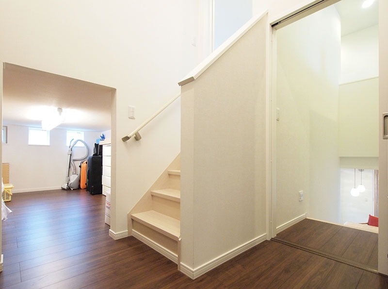 階段を上ると、まずは車庫の真上にある中2階に。そこは踊り場兼クローゼットになっていて、家族の洋服ダンスなどが置かれています。ご主人が仕事で夜遅く帰ってきた時に、奥様を起こさずに着替えができるようにという気づかいです。