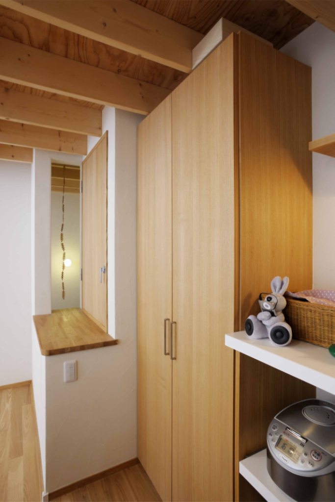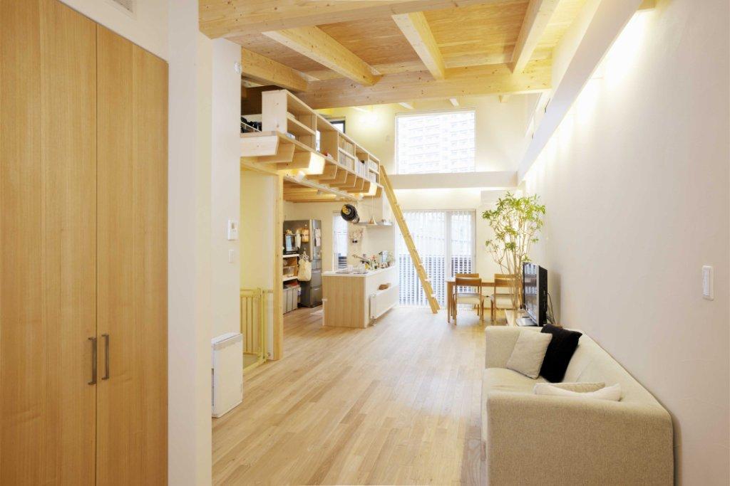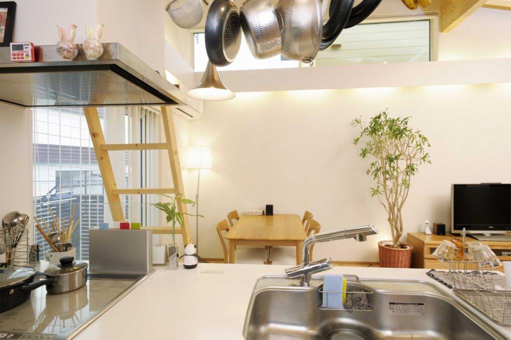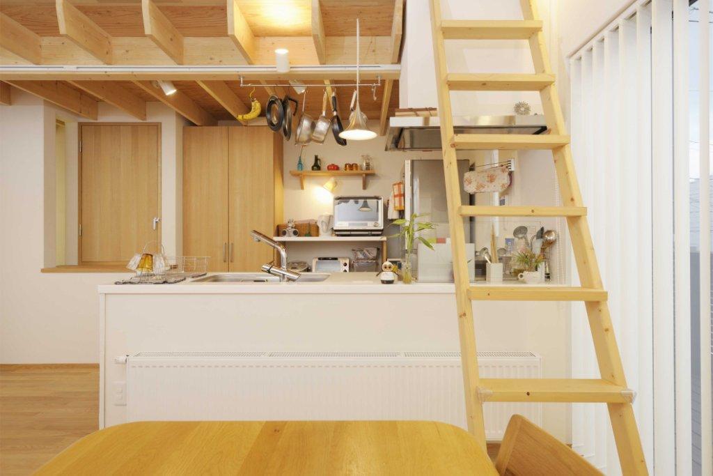 キッチンの上にロフトを作るというなかなかない発想ですが、空間をうまく利用するという面で理にかなっているとともに、奥様がキッチン、ご主人がロフトにいても呼べば応えられる距離感です。また、豊富な収納で、小さなお子さんがいても部屋がすっきり片付きそうです。