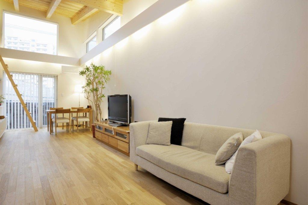 住宅街で日当たりの条件がいい場所ではないため、2階にメインの居室を作ることで、大きな窓から光をたくさん採り入れられるようにしました。最も光の当たる窓際にキッチンとダイニング、中央にリビングを設けました。