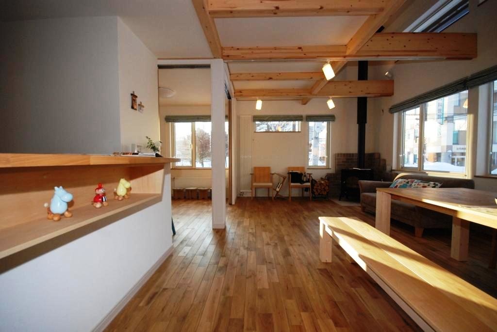 三角屋根(落雪防止タイプ)や無垢フローリング、内装は塗り壁などのデザイン・素材面のこだわりも多く取り入れる