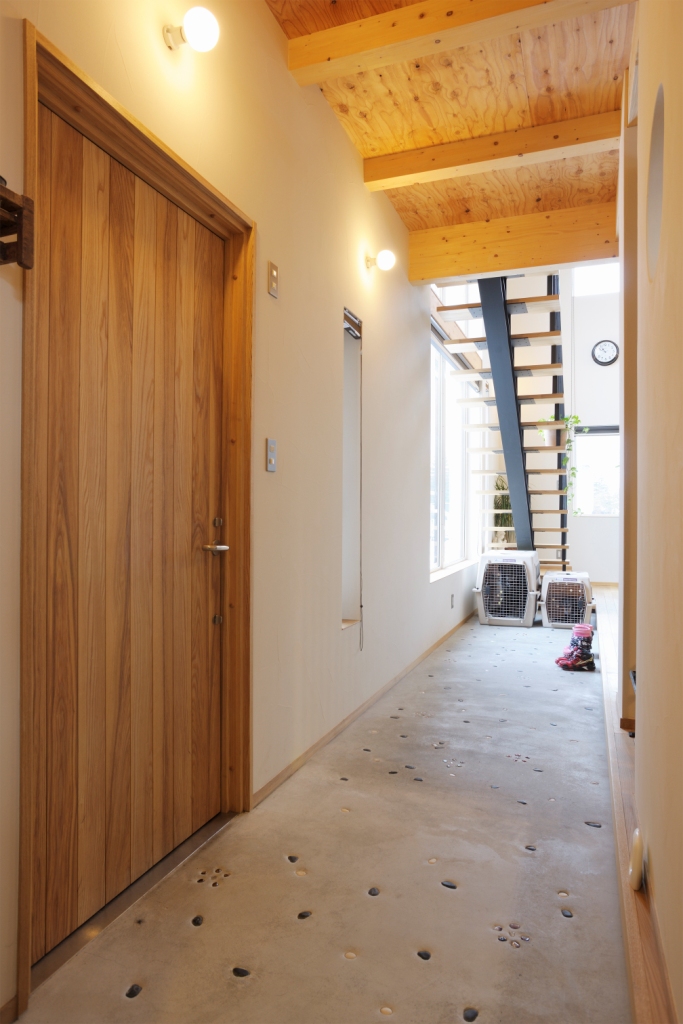 hokushin20130216.jpg 一階はキッチン、リビング、ダイニング、書斎が一体化した大空間。 お母さんは料理をしながら2人の子どもたちと楽しくお話ができます。 大きな窓から降り注ぐ光。 リビングからは2階の子ども部屋も見渡せます。 hokushin20130216 (5).jpg 玄関(写真左)の正面は目隠しの壁。この写真のように長い土間空間が広がります。遊び盛りのお子さんたちが、外から帰ってくると、ここで汚れた衣類を脱いだり、ワンちゃんの足をふいたり、ととっても便利な空間です。 hokushin20130216 (2).jpg リビングと一体化したご主人の書斎(奥の畳部屋).
