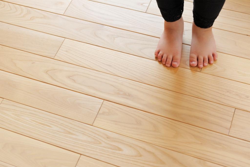 1階の床は無垢のニレ材。断熱性能が高いこともあって家族全員が裸足で過ごしています。オール電化、地中熱ヒートポンプによる暖房で、冬の暖房費は月8000円ほどに抑えられるとのこと。