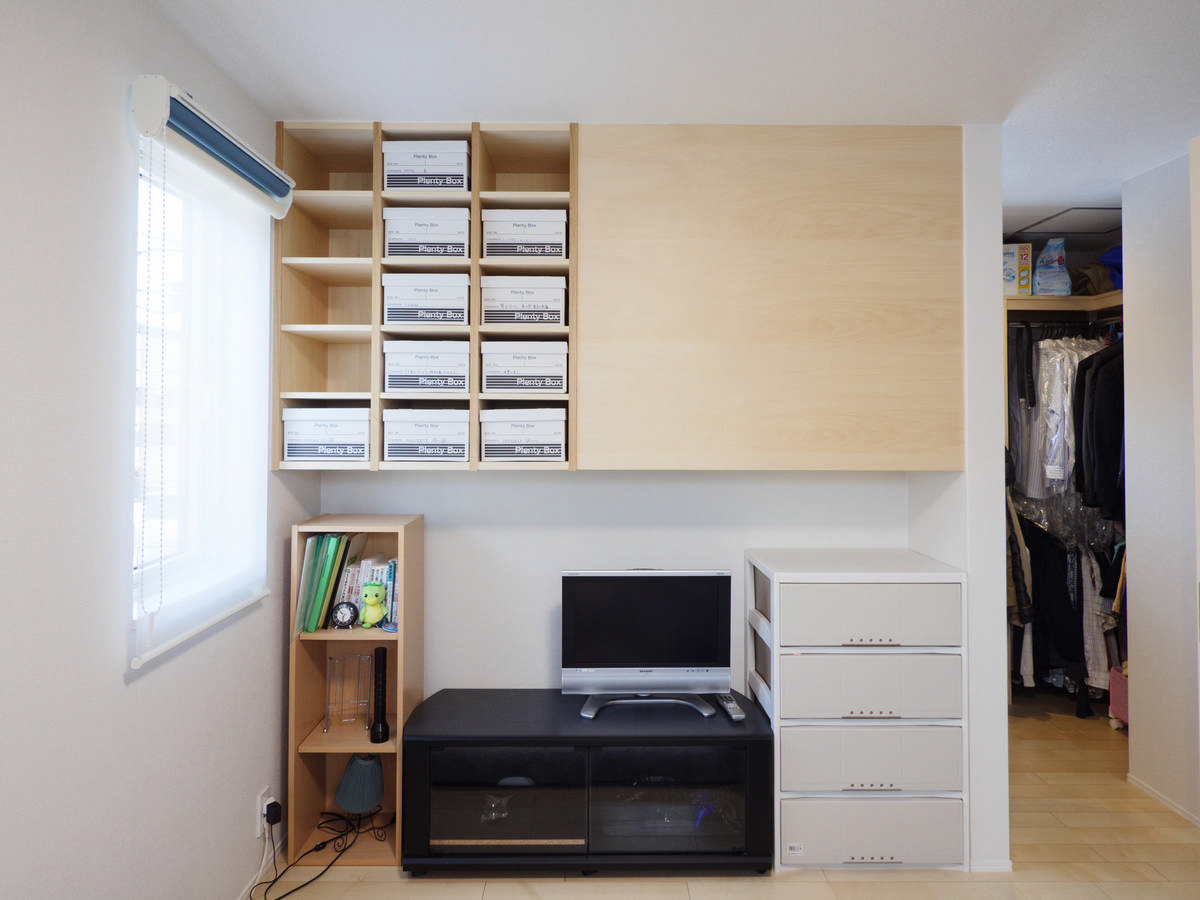 こちらは寝室です。棚は、持ち込む家具などが下に納まるよう寸法を考えた造作。棚には、バンカーズボックス(アメリカの銀行で100年前から使われている書類整理箱)にマンガ本がシリーズごとに入っています。棚の高さはバンカーズボックスのサイズに合わせて調整してくれたそう。これなら背表紙の派手な色使いのマンガ本が目立たず見た目スッキリ。読みたい時に箱ごと引っ張り出せば、全巻一気読みもできますね。右奥にはウォークインクローゼットも。結構広くて収納力抜群です。