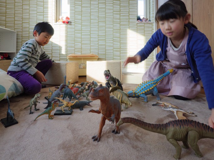 おもちゃ箱いっぱいの恐竜たち!次々と好きな恐竜を順に紹介してくれる男の子に「恐竜の他に好きな生き物はやっぱりトカゲとか?」と聞いてみたら即答で「鳥」と回答。理由を聞いてみると「今いる生物の中で、一番恐竜に近いから」と、恐竜愛に貫かれた、小1とは思えない深い知識を披露してくれました。