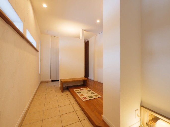 雪で濡れた靴を玄関に置いておいても翌朝には乾きます。1階の床材は無垢のナラ材を採用、足の感触も良く、自然な温かみを感じます。