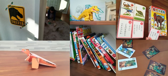 また紙粘土製の黄色い恐竜やイラストも。さらに、弟さんが「恐竜出没注意」と貼られた自分の部屋から持ってきてくれたのは恐竜カルタや恐竜トランプ!!そこでおそるおそる部屋に入ってみると・・・