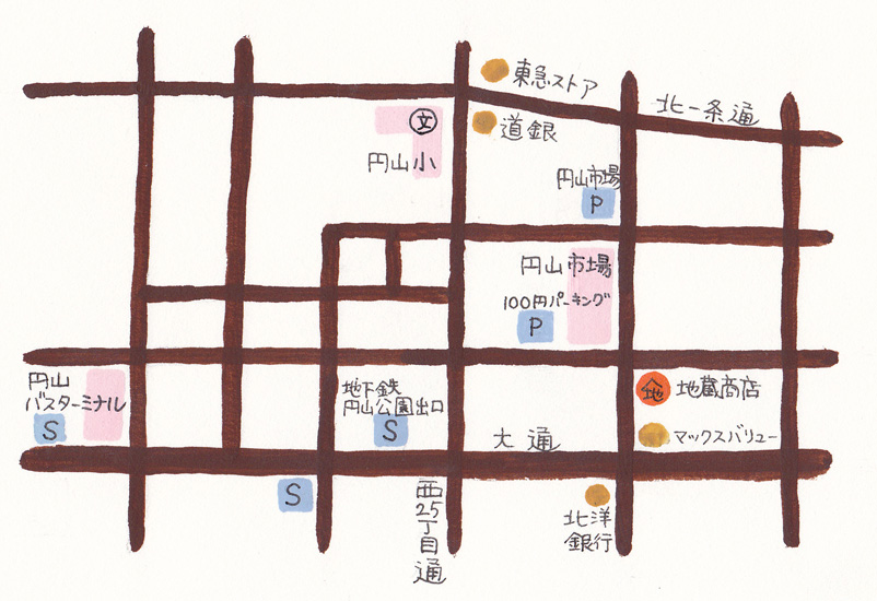円山公園から大通りを中心部に向かい、大通り西23丁目(マックスバリューの角)で左に曲がって直進。右手にあるグリーンパーク23というコンクリートの建物の1階。赤い文字で「地蔵商店」とかかれてある。車で来る場合は駐車場がないので、近くの円山市場の駐車場(30分157円、1時間315円、市場でお買い物500円以上の場合は1時間無料、日曜休み)か、円山市場の隣の100円パーキングを利用してください。