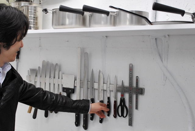 ご本人にも登場してもらいました。「このナイフはこういった調理工程のときに・・・」実はウソですヤラセです。1分間以上のポーズに耐える久々湊さん。