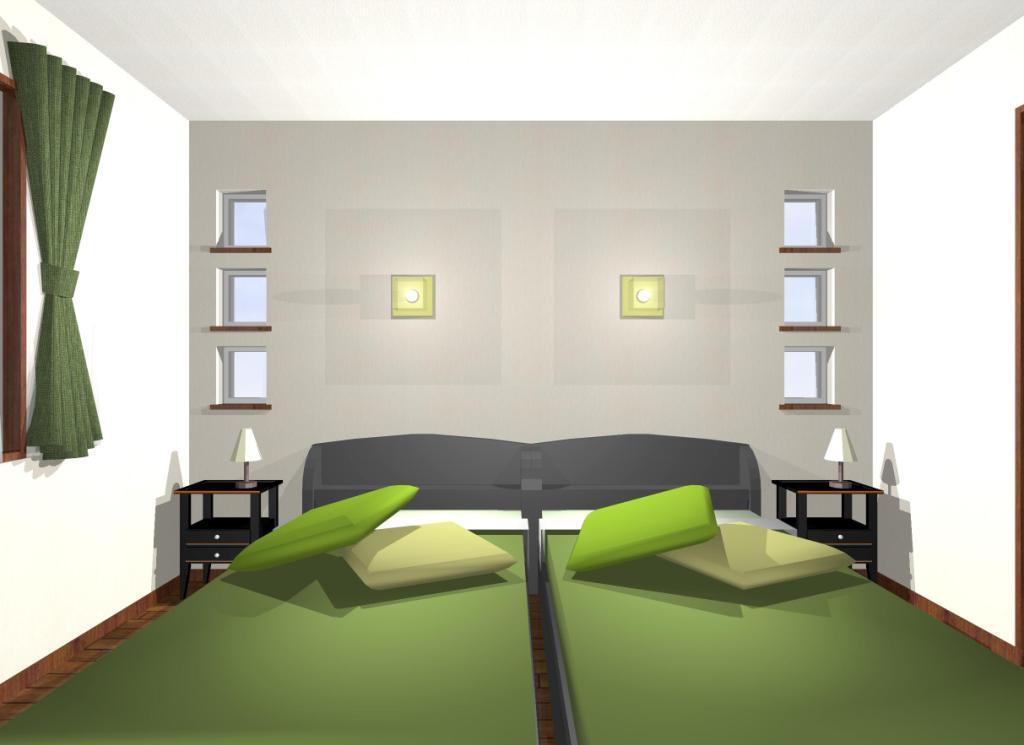 当然内観にも当てはまることです。寝室のベッドの置き方、背面の窓のつけ方、壁付灯のつけ方を左右対称に設定するだけでも安心できる寝室になります。