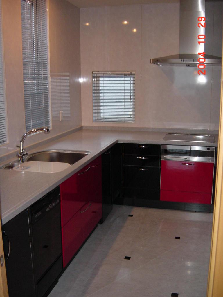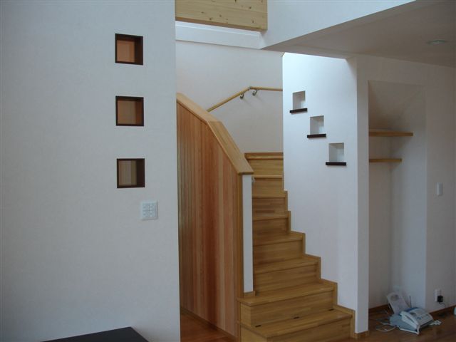 内部でもたくさんあります。洗面台のカウンターの上端にあわせてタイルを貼るとか、玄関正面の壁に掘込みを作って(ニッチといいます)照明をあてるとか、キッチンの床に色の違う小さなアクセントを施すなど。