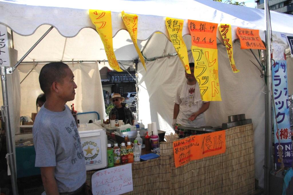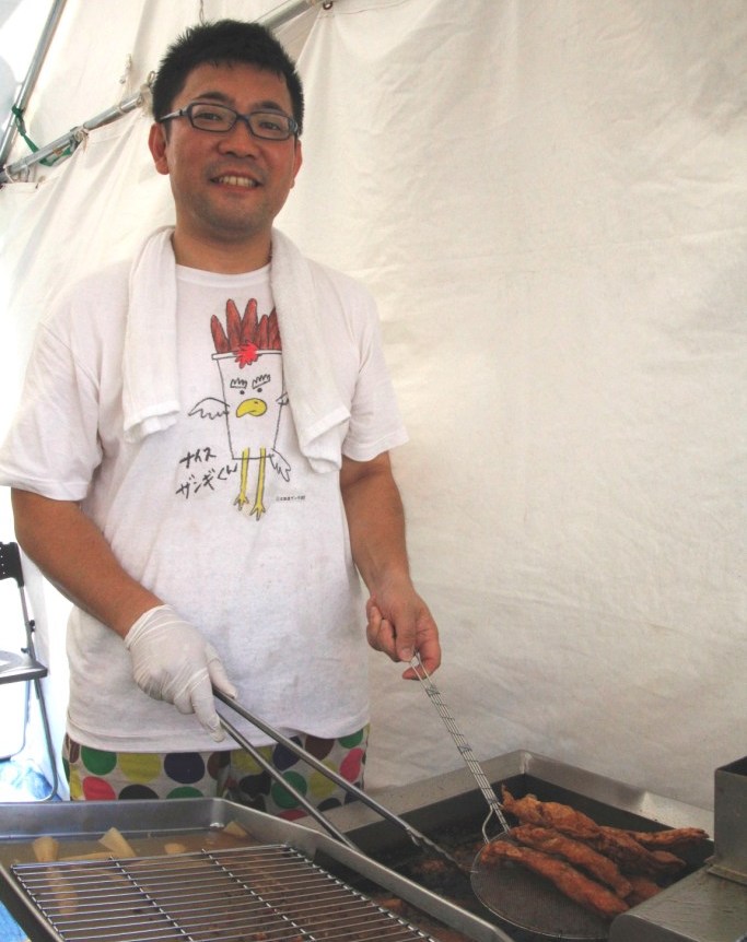 お祭りのブースをのぞいてみると、額に汗を浮かべながらザンギを揚げる、北海道ザンギ連盟事務局長の金井さん。キツネ色に揚がるザンギと油のにおいが、何とも食欲をそそります。ちなみに金井さんが着ているTシャツは、北海道ザンギ連盟のキャラクター「ナイスザンギくん」だそうです。