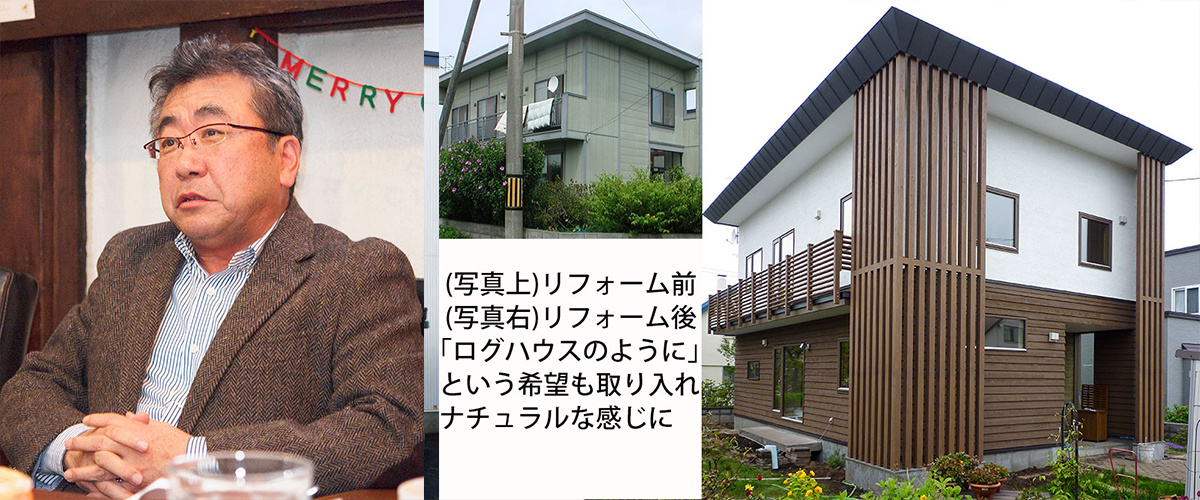 吉田純治さん(ヨシケン一級建築士事務所) 兄が吉田建産(株)という建築会社を経営。父の代からやっていた。自分の好きなものをつくりたいという思いが強く、別部門を立ち上げ、設計も施工も行う。先代からの古いつきあいのお客さんからのリフォーム依頼も多く、「建て替わったの!?」というくらい変えてしまうフルリフォームが得意。写真 冬の寒さと結露を克服し、ウッディな住まいに大変身