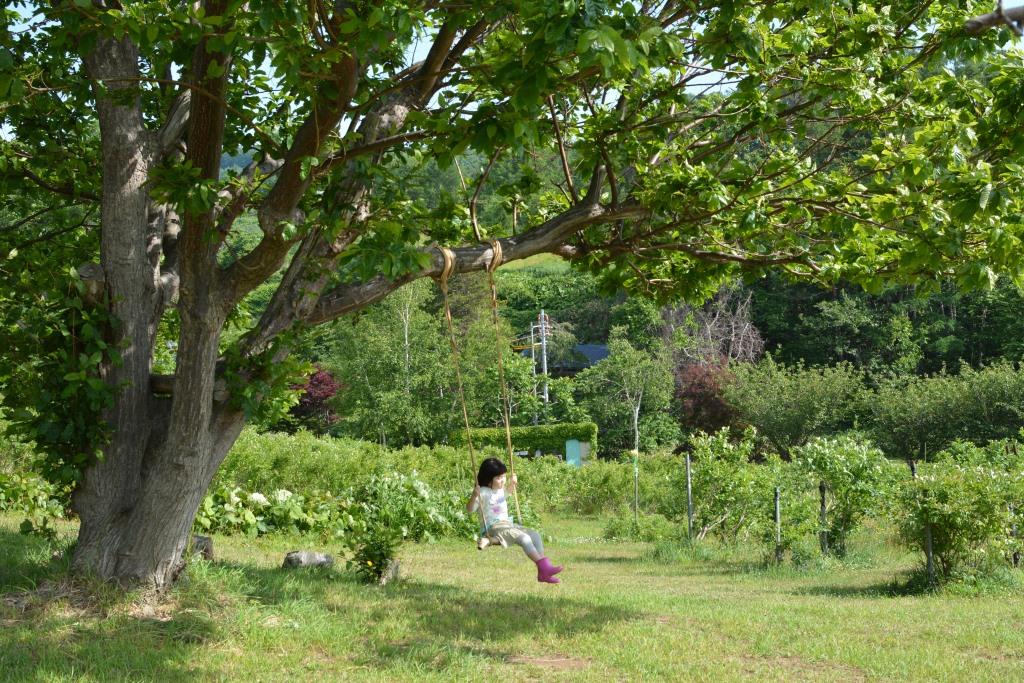 その後、開園1カ月前位の余市、ブルーベリーの丘くりはらで遊びました。ブルーベリーの生育順調でナイス。アロニアの森で探検、栗の木の下でブランコ・・・孫が喜んだか、じいちゃんが喜んだか。詳細はこちら https://www.facebook.com/kblueberry