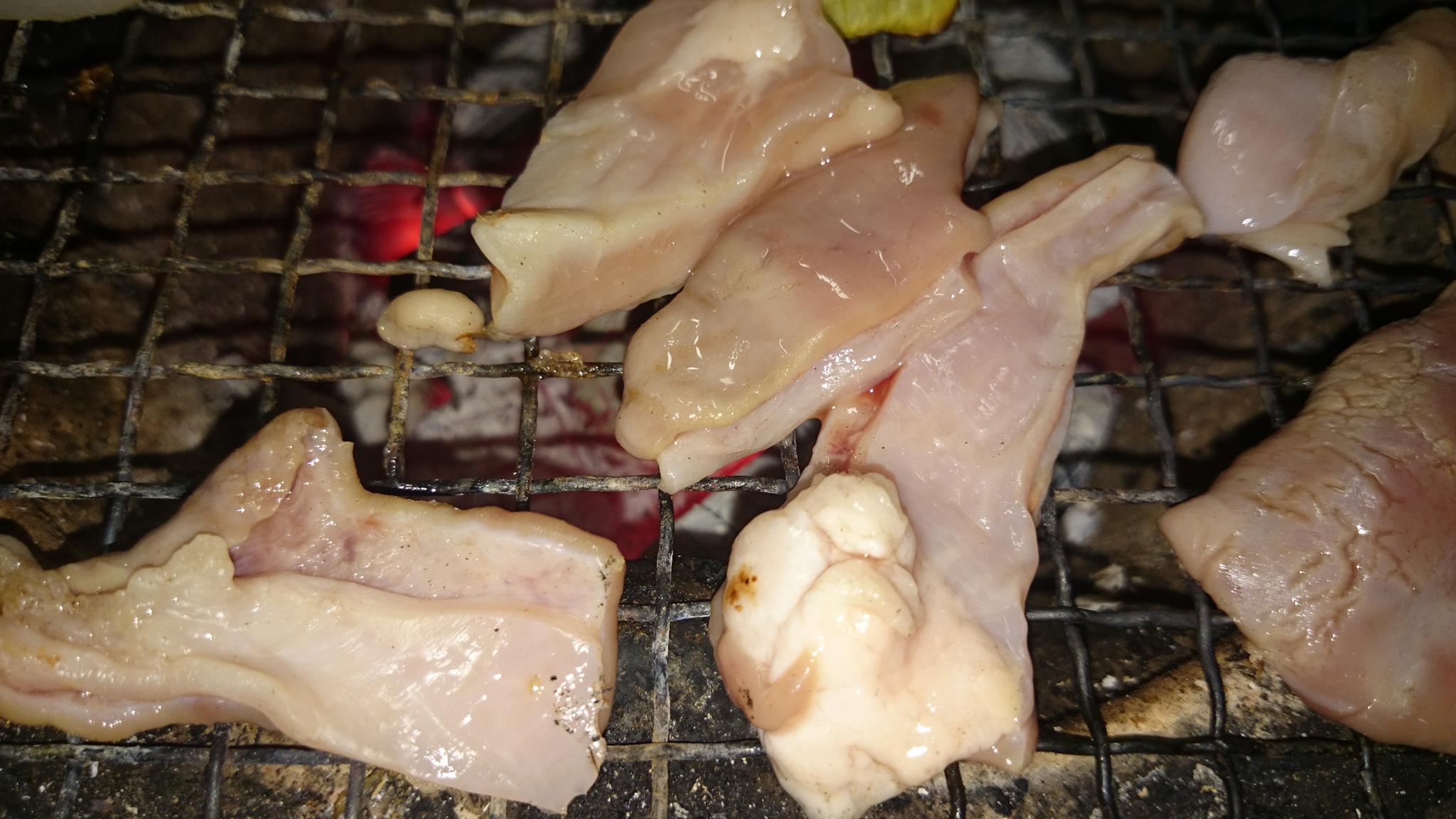 正直誰が店員で誰が客なのか判別できない中、誰も注文をとりにこない中、じっとしていると七輪がやってきて、注文してないのにホルモンとタマネギがやってきます。隣のグループを見るとコンビニおにぎりを持ちこんでいます。ウーロン茶を飲みながらホルモンをやいて食べてみると・・・。塩ホルモンにもいろいろあるんですね。部位がいろいろで一つ一つ味も食感も違いました。