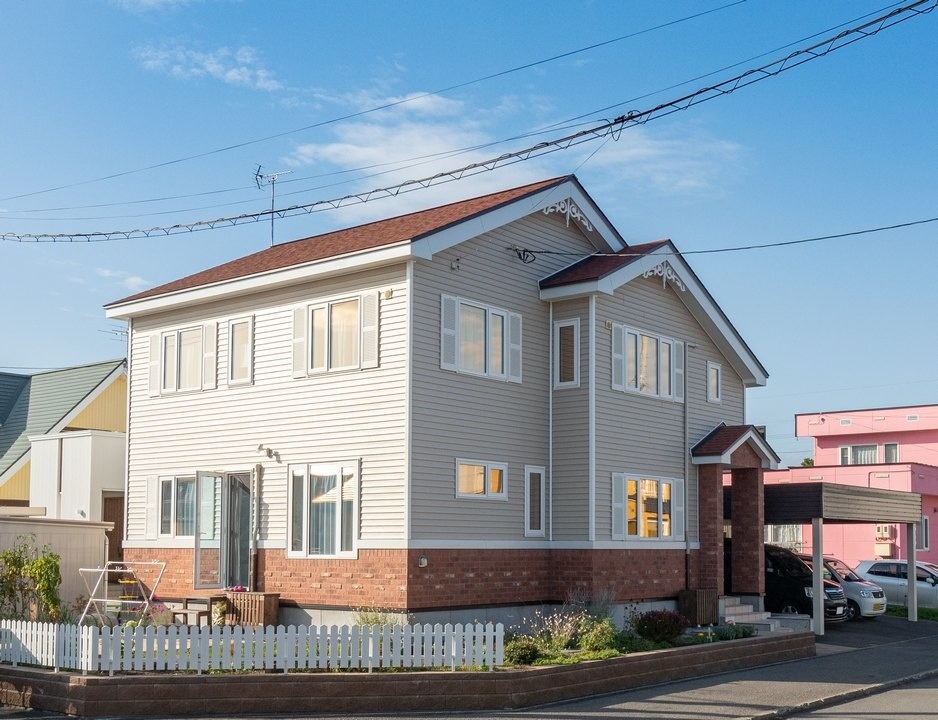 Sさんのお宅は、旭川空港へのアクセスが良く、公園や商業施設、学校なども充実した新興住宅地に建っています。外観は三角屋根にホワイトの外壁、均一に並んだ小窓のついた洋風な佇まいです。