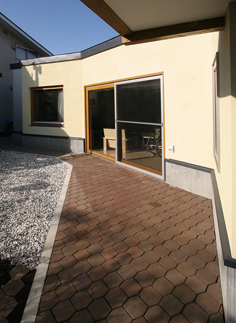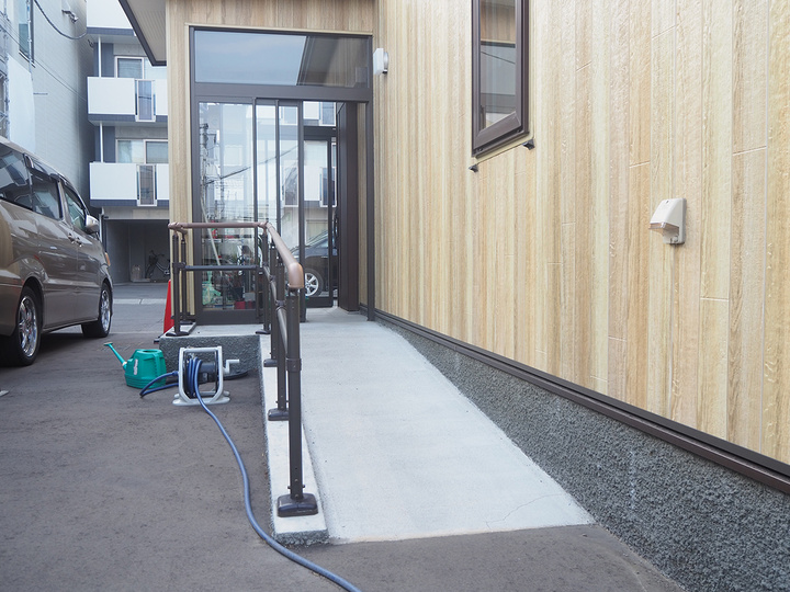平屋建ての住まいの全てのスペースに、車いすでアプローチすることができるよう室内の段差を完全に解消したのはもちろん、毎日お仕事に出かけるNさんがカーポートまでスムーズに移動できるよう、玄関から屋外にかけても完全にフラットにしています。