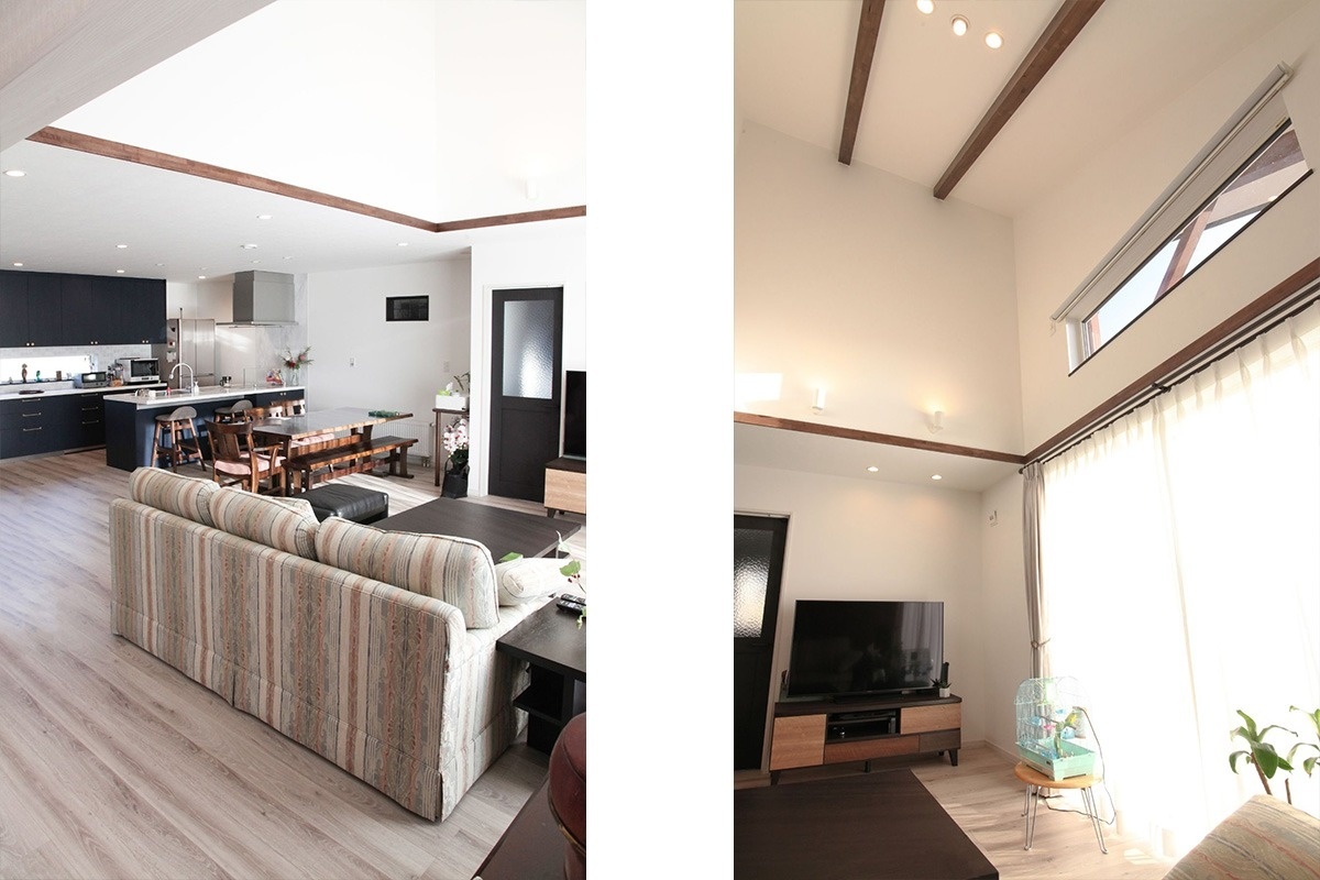 また日差しを取り込むためにLDKには三面採光の吹き抜け天井を提案しました。この吹き抜けがあることで、伸びやかな空間が生まれています。