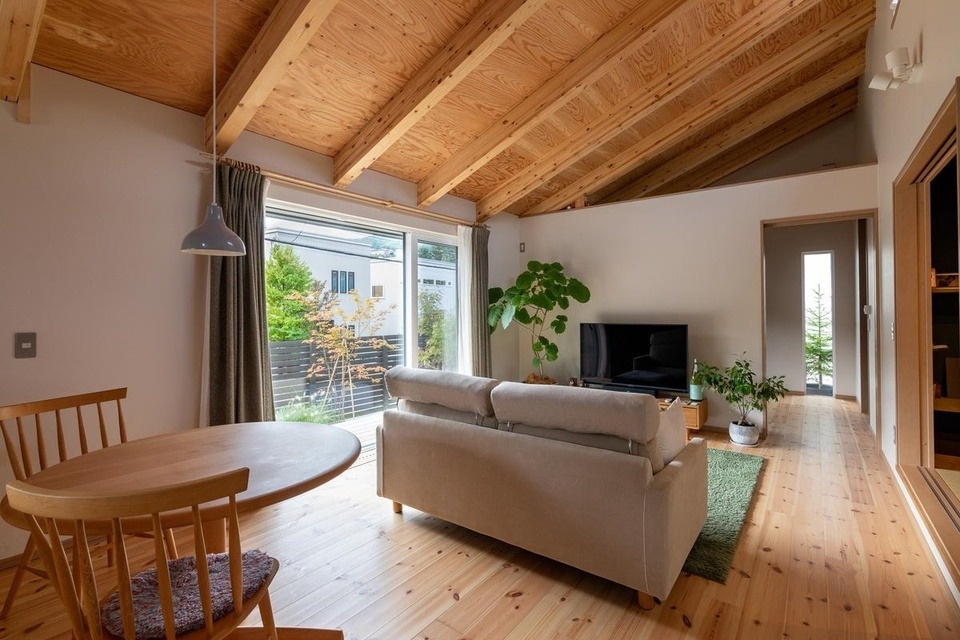 H邸は平屋ですが、勾配がついた天井は最頂部で5.5mととても高く、屋根のたる木を見せ、構造が現しになったおおらかな空間となっています。
