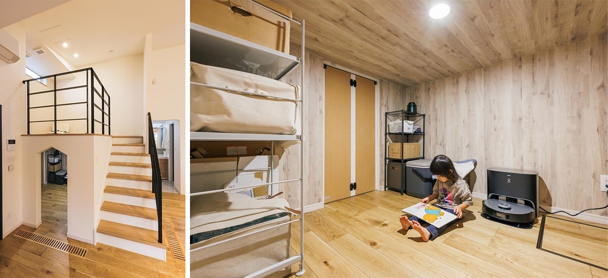 教育関係の仕事をされている奥様は、自然と子ども目線での家づくりに。「移動が楽で暮らしやすい平屋の家を」という大人の希望と「家に階段がほしい!」という子どもたちの希望を両立させるために、LDKの一角にスキップフロアを作りました。その下は収納を兼ねた秘密基地のような空間になっています。