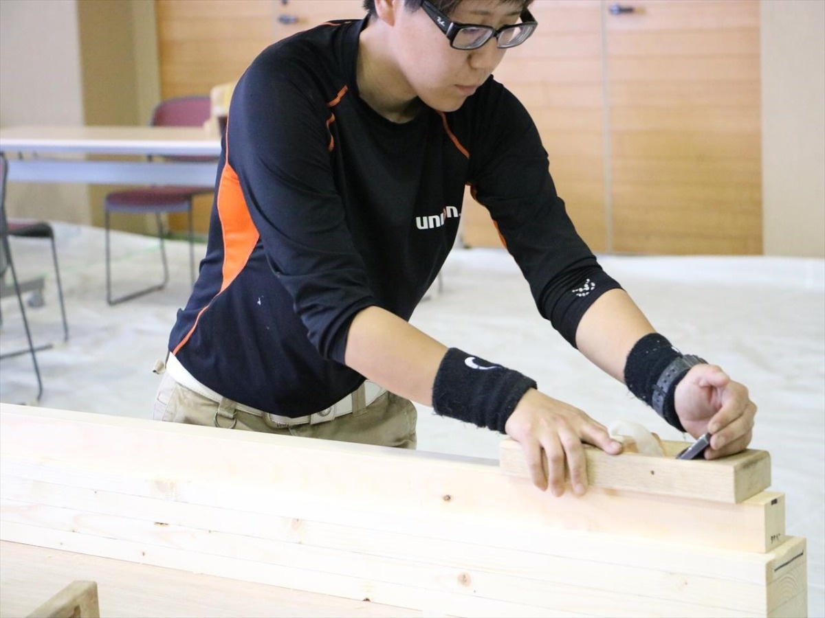 一般の方が参加できるちびっこ大工のコーナーには北海道職業能力開発大学の女子学生の姿が。「授業の一環でやったことはありましたが、鉋を引くのに力が要るし、難しいです」と言いながらも、作業を楽しんでいる様子です。