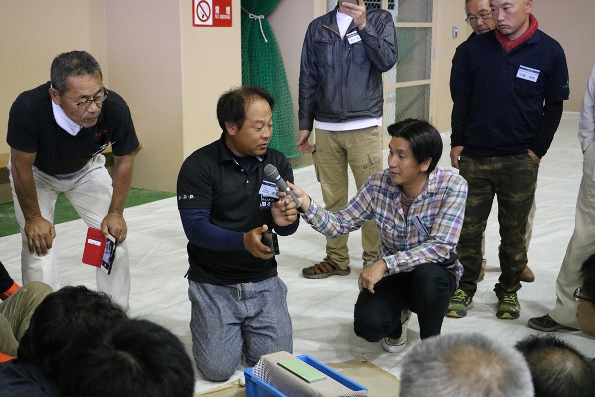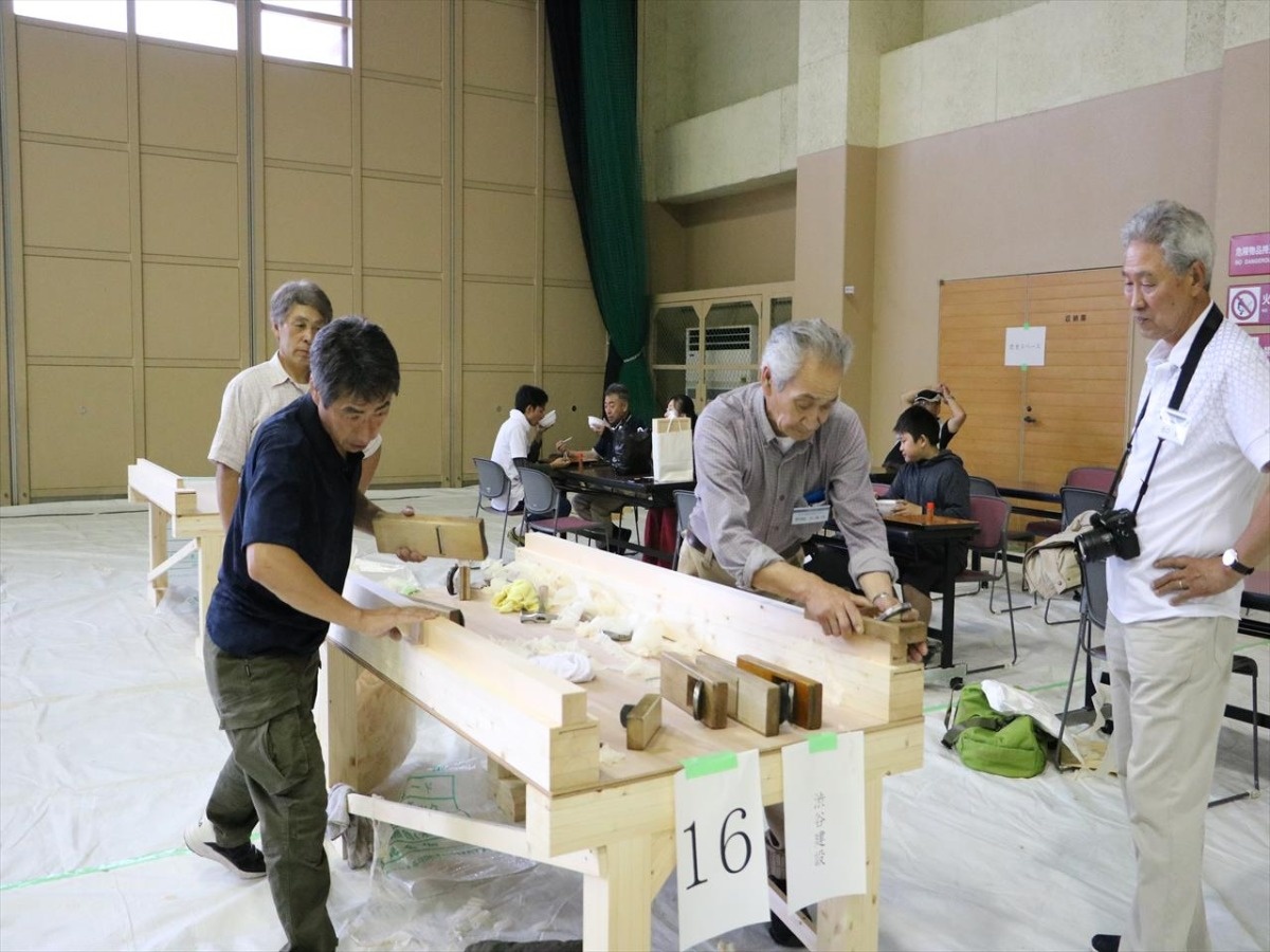 大会には社寺建築専門の宮大工で鵤工舎創設者の小川三夫棟梁や、子息で鵤工舎代表の小川量一さんも駆け付けました。鉋名人として知られる川口康弘さんによる研ぎの実演や、削ろう会蔵王全国大会優勝者の久保正幸さんによる削りの実演が行われると多くの人だかりができ、息を呑むような技の披露に注目が集まりました。