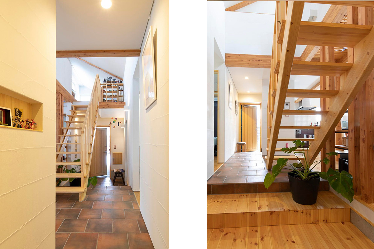 「買物に出かけるときはバス通り側から出たり、車のときは裏通りから出たり、その時々で使い分けられて便利です」と奥さま。庭への動線も2WAYです。土間からロフトへ上がる階段は、骨組みだけで構成されたスケルトンタイプ。踏み板は山小屋のように厚ぼったくならないよう、踏み板を繊細に細工しています。