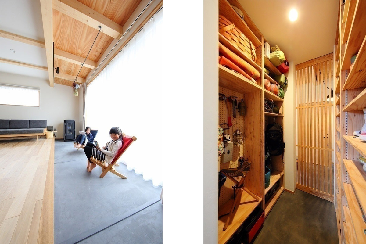 リビングにいると、ご夫婦の好きな絵や雑貨で統一され、家全体の印象がすっきりしていることに気付きます。それには訳がありました。例えば、玄関の正面には木の格子戸があり、そこを開けると・・・シューズクロークがありました。そこには靴のほかに、キャンプ好きなご家族なので、シュラフやランタンなどさまざまなキャンプ用品が玄関そばに収納できるようにプランされています。こだわりのキャンプ用小物は、いつでも眺められるよう壁掛け収納にしています。こうした工夫で家の中が整理整頓できているのです。