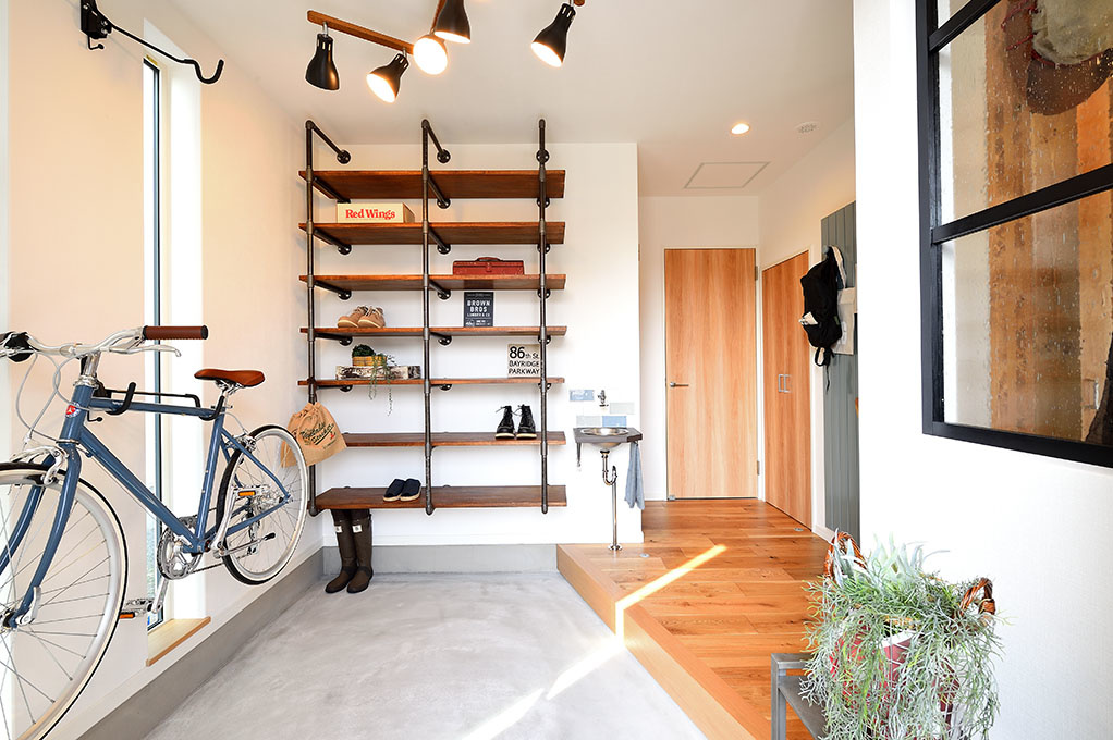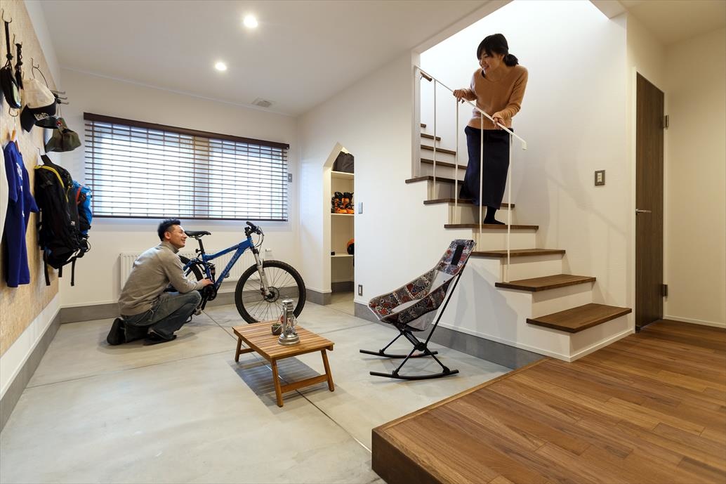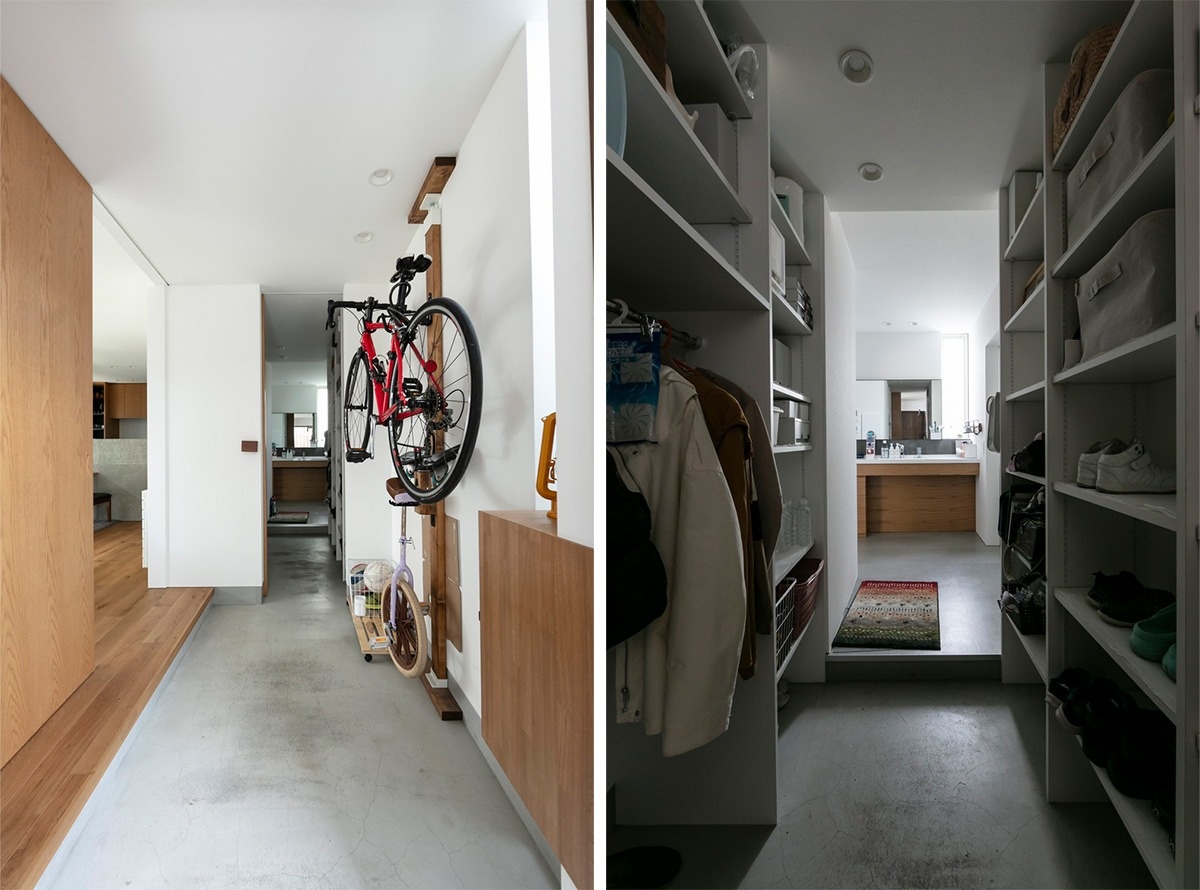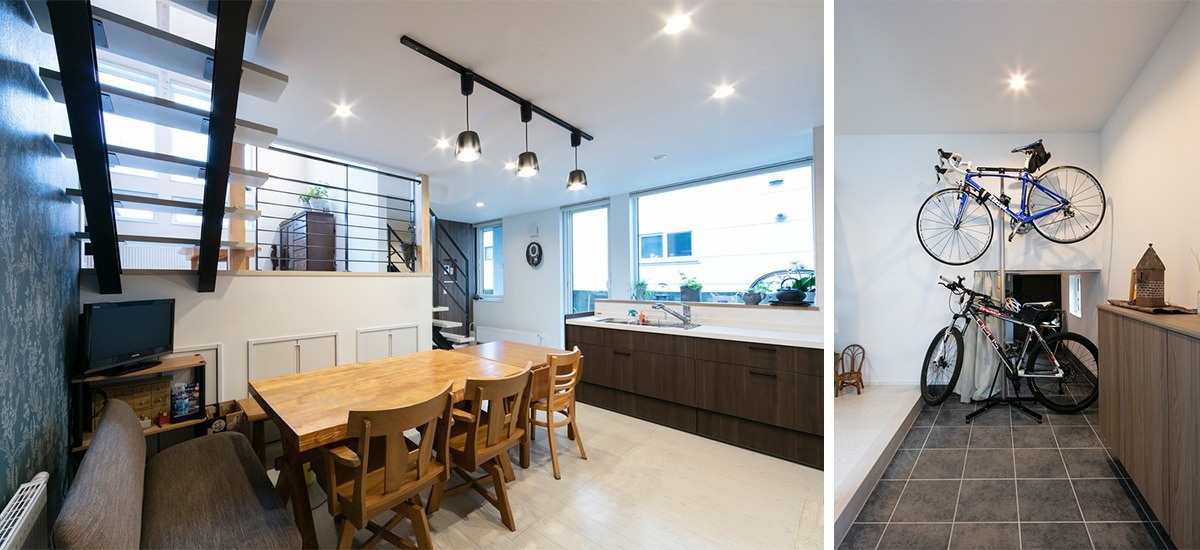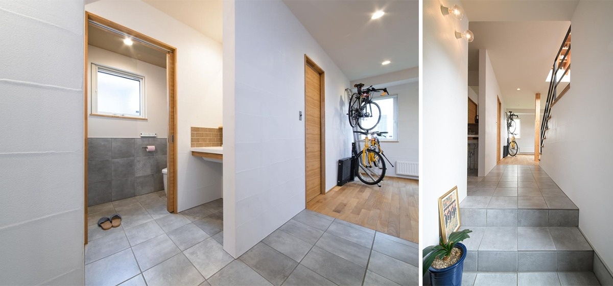 Tさんの趣味の自転車がかっこよくディスプレイされている玄関土間の奥からも、リビング下のグランドストレージに出入りできます。また、ダイニングの裏にある洗面所ともつなげ、使いやすい回遊動線にしました。