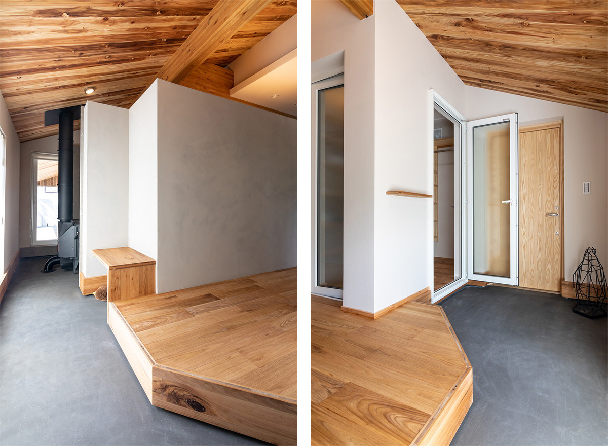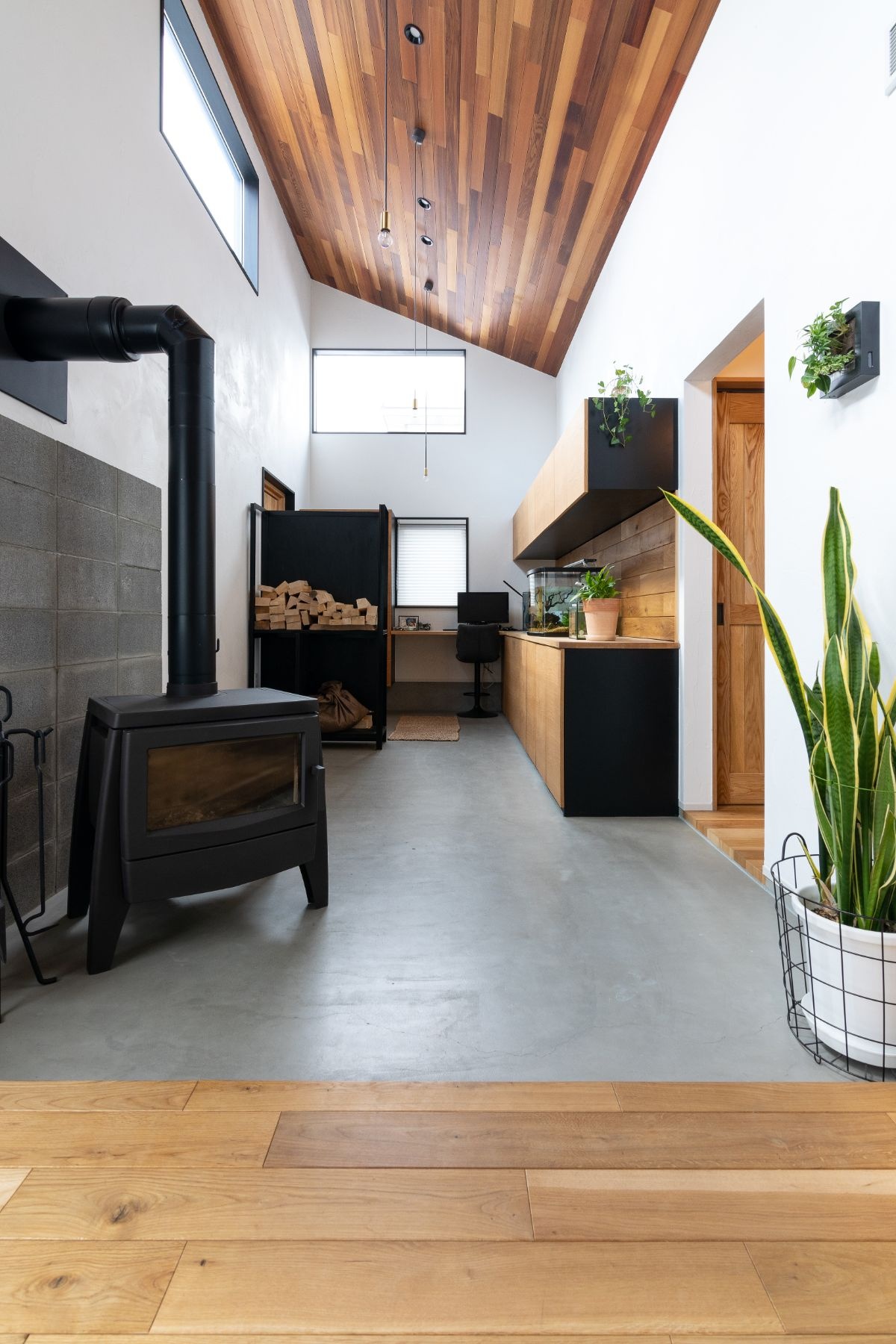 H邸には自然素材がふんだんに使われています。家全体が木のぬくもりにあふれ、リビングには暖房と生活の楽しみを兼ねる薪ストーブのある土間が。