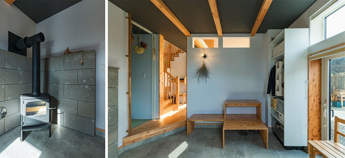 玄関は広々とした土間空間。薪ストーブを設置し、玄関という役割を超えたくつろぎの場となっています。