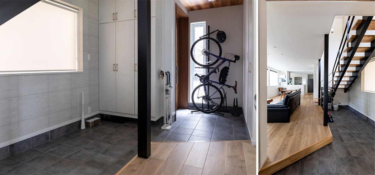 「玄関の土間も広くしています。自転車のメンテナンスやスキーやスノーボードのお手入れ、DIYなどもできますよ」