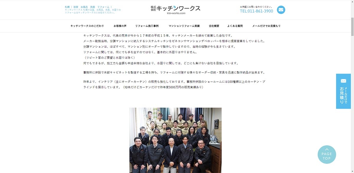 また、同社のホームページは基礎構築のみ専門業者に任せ、テキストやブログ更新などは自社で管理している。荒井社長が「ホームページに魂を入れた」と話す通り、社長自らが書いたストレートな会社紹介がユーザーに伝わり、メール問合せは月に70~80件。概算などをやり取りし、下見に訪問した段階で、ほぼ成約に至り、成約率は3~4割にも達しているという。