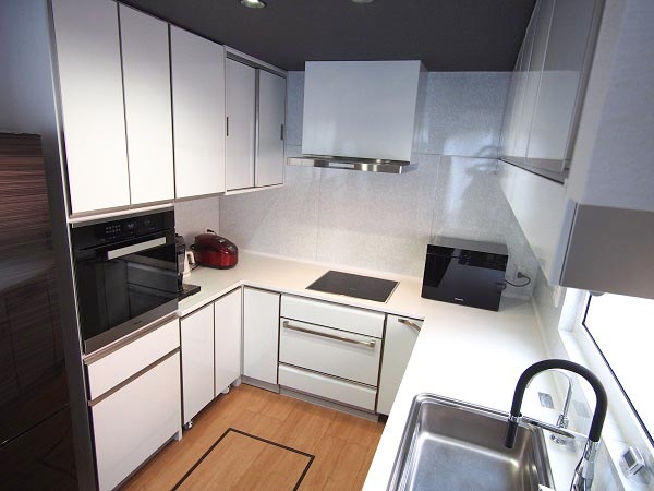【AFTER】窓際からL字までが既製品で、向かって左手の吊収納や下部収納、U字の天板は同社の加工による。左手前にあるのは海外メーカーの食洗機。施工は容易ではなく、経験値が必要だ。