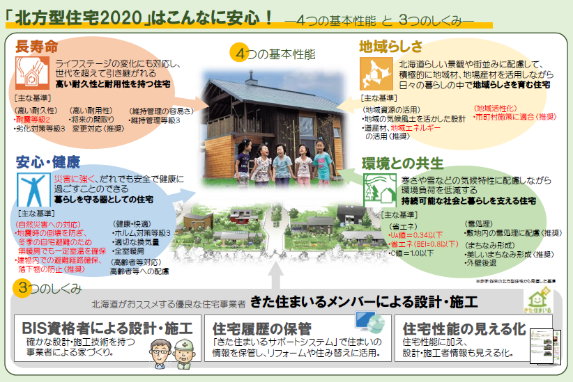 北方型住宅は1988年から産学官の連携で開発がスタートし、2005年には新たな展開として「長寿命」「安心・健康」「環境との共生」「地域らしさ」という4つの基本性能と、それに基づく具体的な基準を定めた新・北方型住宅にリニューアル。2010年にはさらに性能を高めた北方型住宅ECO基準が加わった。