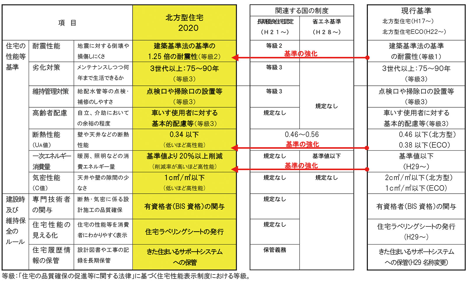 性能に関する必須基準では、断熱性能=UA値が0.34W以下(北方型ECOは0.38W以下)、一次エネルギー消費量が省エネ基準比20%削減(同省エネ基準以下)、耐震性能が耐震等級2(同等級1)となり、断熱性能は2020年を見据えた住宅の高断熱化技術開発委員会・HEAT20のG1グレードと同水準で、札幌版次世代住宅基準のベーシックレベル(同0.36W)を上回る。相当隙間面積=C値1.0cm2の気密性能や、劣化対策、維持管理対策など他の必須基準は北方型住宅ECOから変わらず、BIS有資格者による設計・施工や、きた住まいるサポートシステムへの履歴情報保管も、これまでと同様に行う。