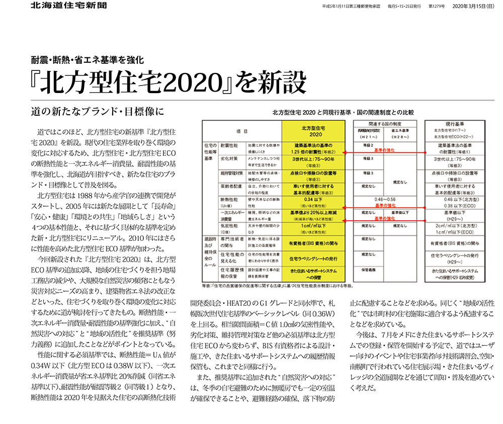 こんにちは!IEZOOM編集部です。今回はIEZOOMを運営する北海道住宅新聞社の本紙(北海道住宅新聞)2020年3月15日号4面より、北海道が新設した北方型住宅の新基準『北方型住宅2020』の記事を抜粋してお届けします。