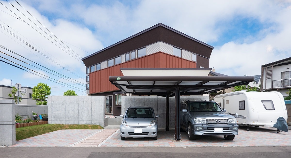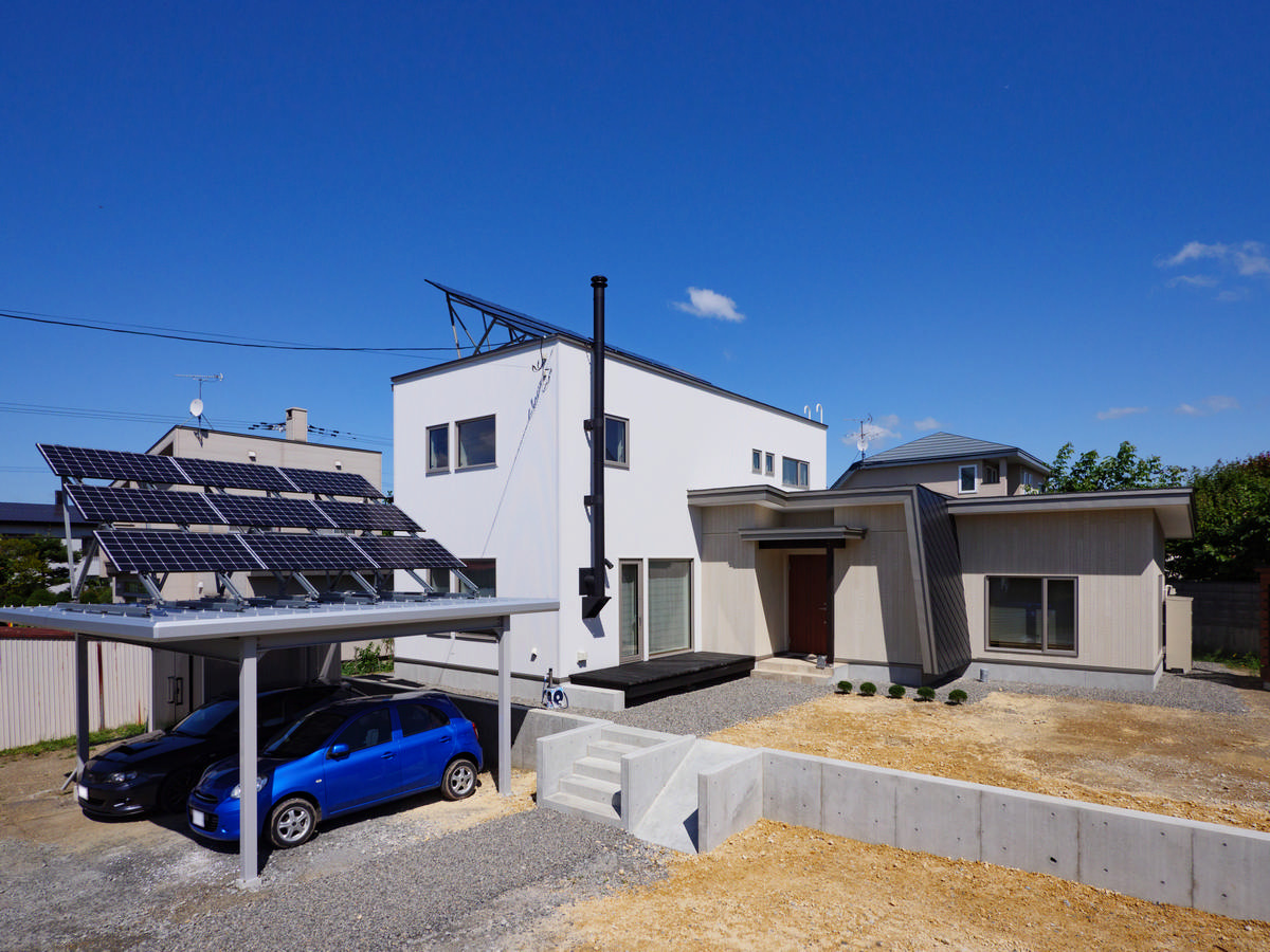 住宅とカーポートの双方の屋根に太陽光パネルを設置 北海道帯広市/水野建設