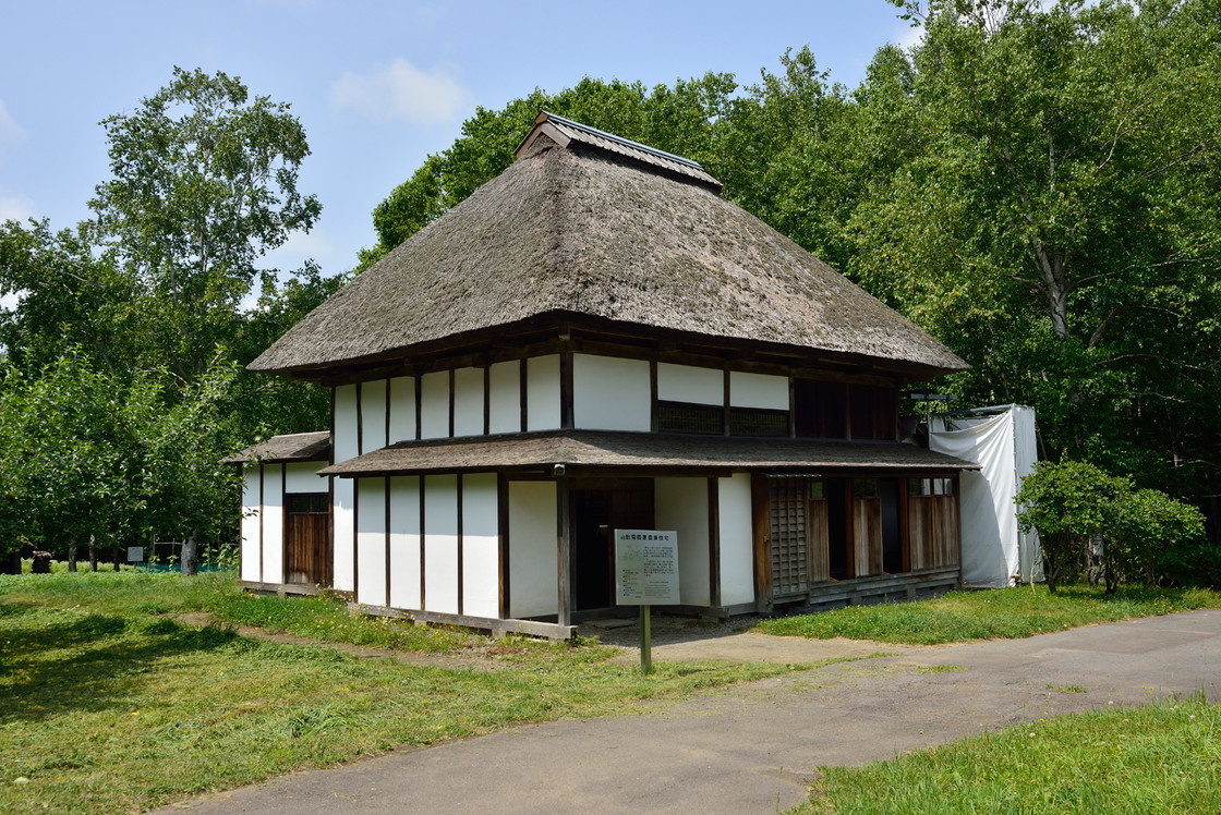明治期の農家の住宅(北海道開拓の村蔵)。この家は木造のかやぶき屋根で、屋根は屋根勾配が2段階で構成される「しころ屋根」と呼ばれる形をしています。