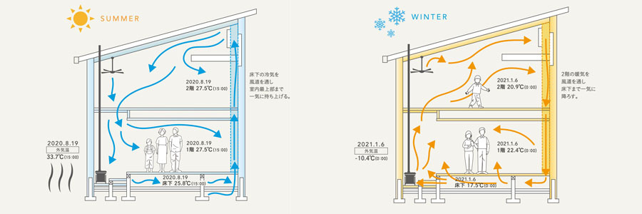 冷房は、夏でも18~20度に保たれる床下の冷気を、省電力のDCモーターファン2台を使って風道を通して2階天井近くまで一気に上昇させ、家全体に循環させます(弱運転で1台3w、使用頻度の高い強運転で4.8wほど)。人が快適に過ごせる25~28度のちょうどよい室温が省電力で叶う、特許申請中の技術です。