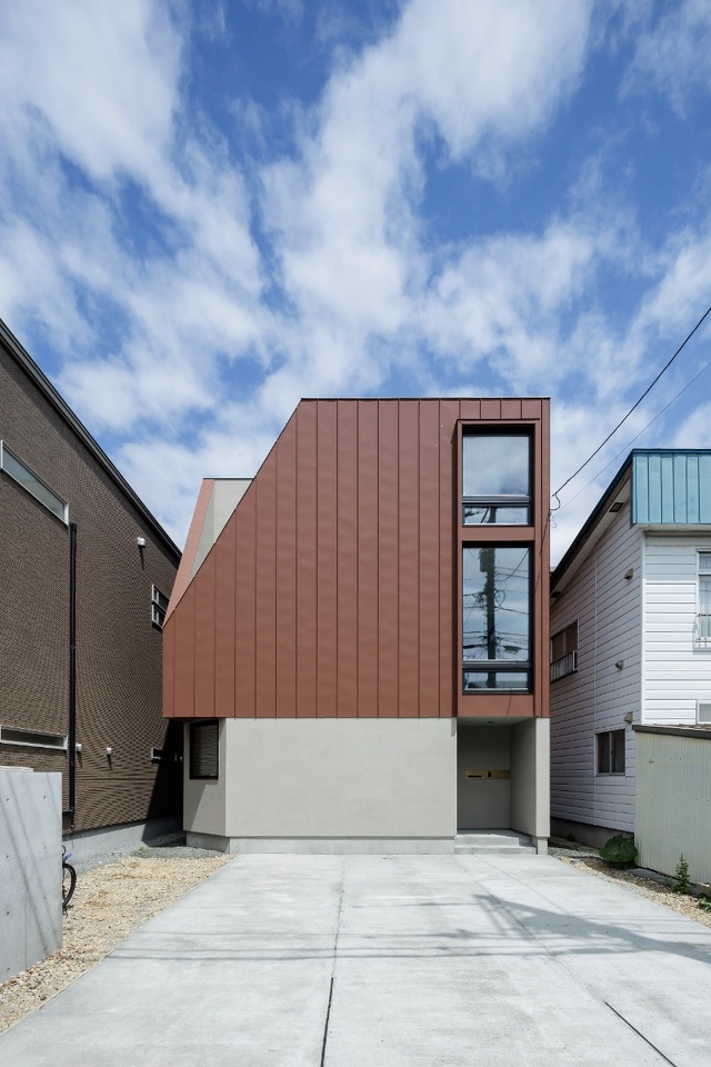 住宅街の路地を進むと、ひときわ目を引く建物が現れます。斜めにカットされた部分は2階のテラスに光を届けるためのデザイン。1階の外壁は塗り壁で仕上げ、2階・3階部分は「コールテン鋼」風な色合いのガルバリウム鋼板を使用しました。