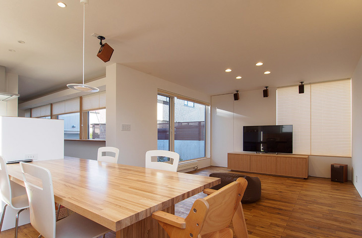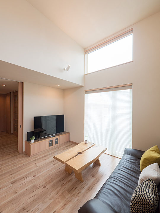 庭を中心に配置して周りを建物で囲むような住宅プラン。リビングにも温かな光が入るこのゾーニングをSさんご夫妻も気に入って、建築に至るまでの基本プランとなりました。リビングは「タンスなど余計なものはまったく置きたくない、すべて収納できるように」というSさんご夫妻の考えで、このようにすっきりとした空間が実現しました。
