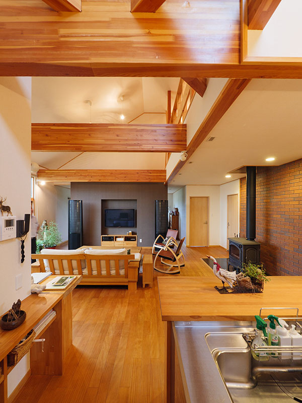 「ホクシンさんのオープンハウスを見に行った時、まずこの木の香りがいいなと思ったんです。間取りはやっぱりこだわりましたね。仕切りをあまり作らずに、子どもたちが宿題したり、遊んでいる様子をキッチンから見渡せるようにしてもらいました。子どもたちは友だちと鬼ごっこをするほど楽しんでいます」と奥さま。