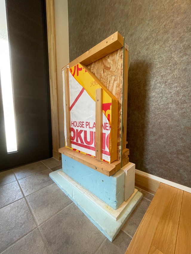 奥野工務店は硬質ウレタンボードで家全体をすっぽりと外側から包む「ソトダン21工法」を採用。玄関にはその模型が展示されています。